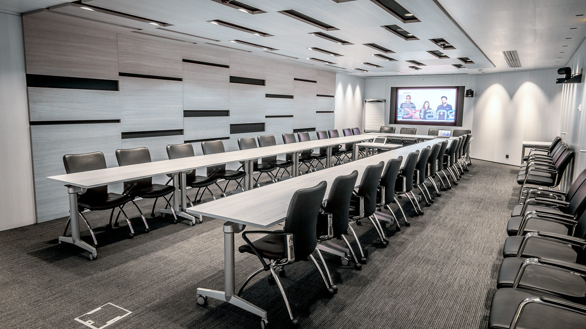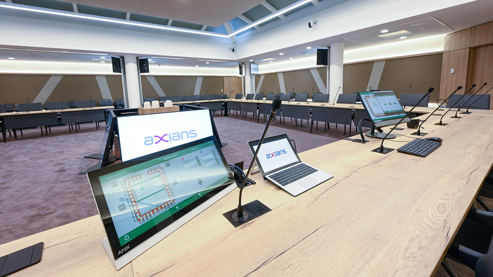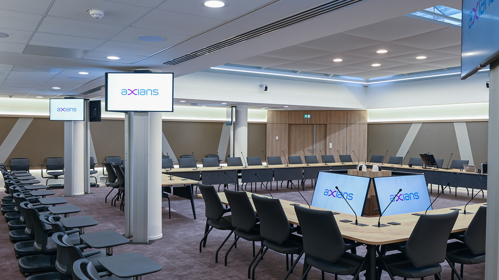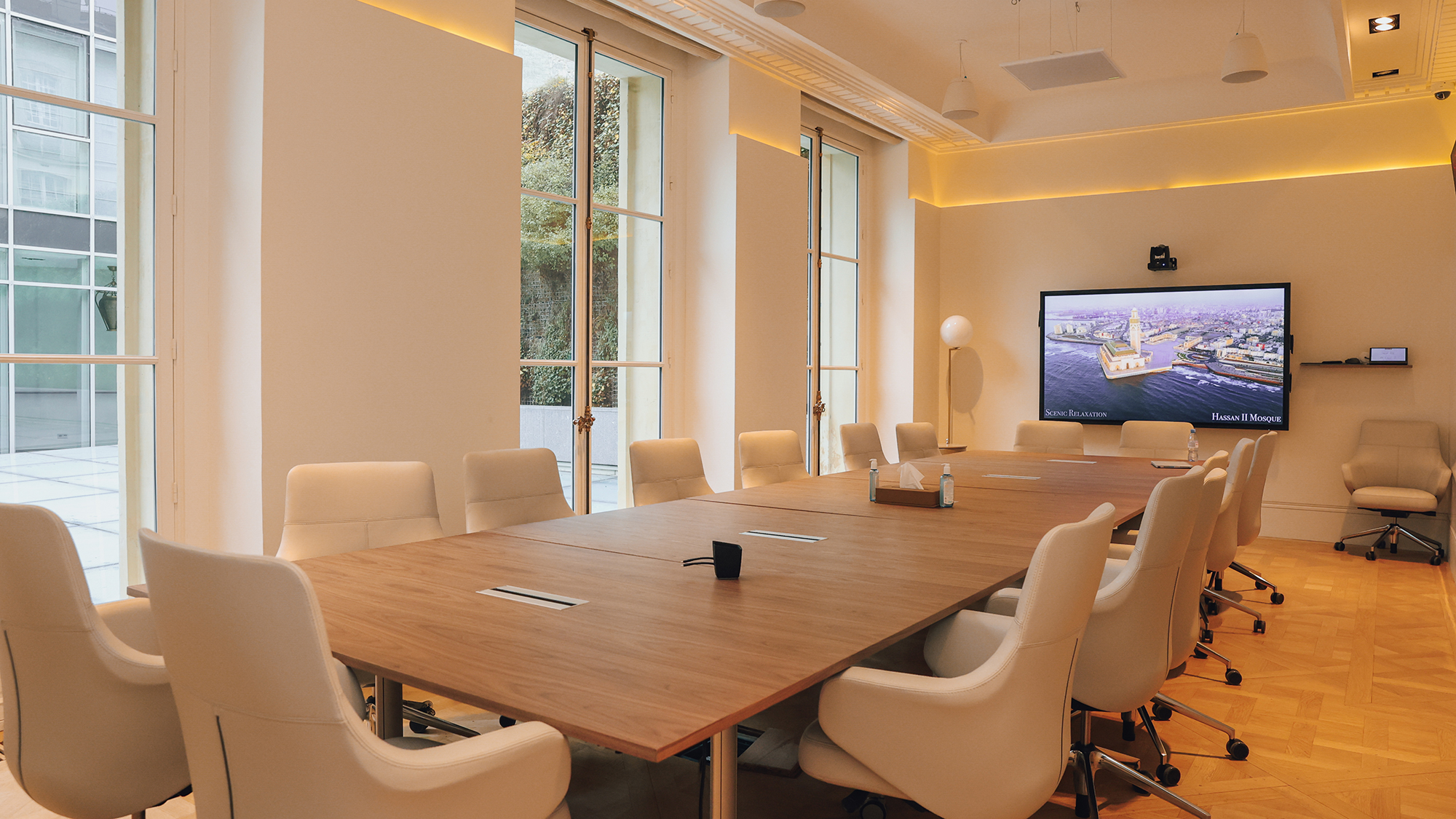 Création de deux salles de conférence haut de gamme, mutualisables, pouvant accueillir jusqu’à 80 participants. La présidence pilote en toute autonomie les deux espaces grâce à une interface IHM intuitive, facilitant la prise de parole et les communications avec les sites distants. La production vidéo s’adapte automatiquement au nombre de participants et au contexte de la conférence, sans intervention technique nécessaire.
