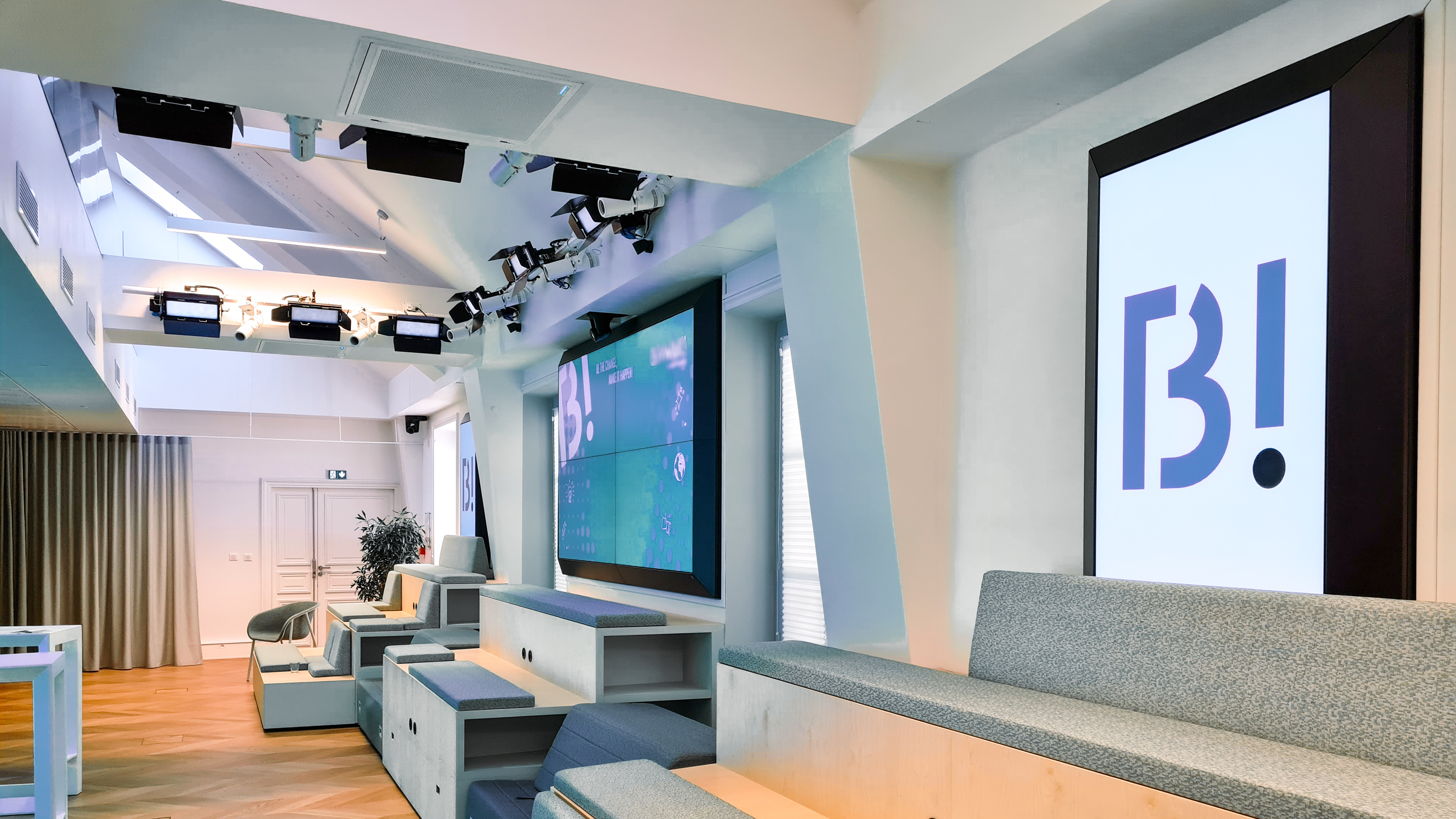 Three spaces were equipped and connected to a central control room for unified AV management. The main area hosts major internal events and external speakers. Rail-mounted PTZ cameras and stage lighting enable high-quality corporate video production for live streaming and hybrid collaboration.